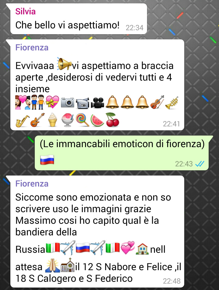 Quando eravamo in Russia, dopo l’udienza, siamo andati a Messa a ringraziare e abbiamo incontrato degli amici di nostri amici che vivono lì. Lavorano in una scuola gemellata con un’altra di Milano. Un bel viaggio ricco direi, che continua a portare novità. In ufficio tutti contenti e ieri abbiamo incontrato anche una coppia adottiva che abita nel nostro palazzo. Quello che viviamo è una grande avventura che spalanca lo sguardo, con segni chiari: non siamo da soli in questo cammino.