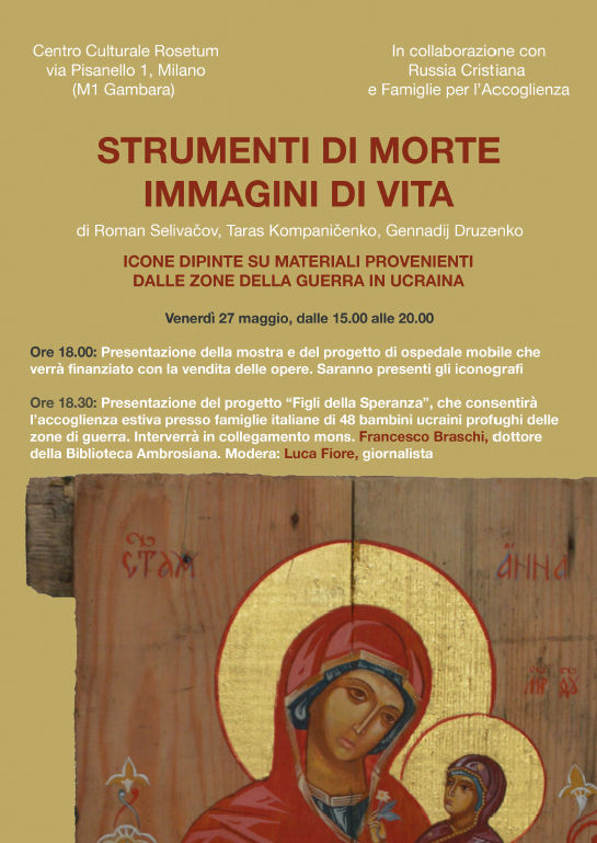 In occasione della mostra di icone dipinte su materiali provenienti dalle zone della guerra in Ucraina, viene presentato al Centro Culturale Rosetum il progetto di accoglienza “Figli della speranza”.