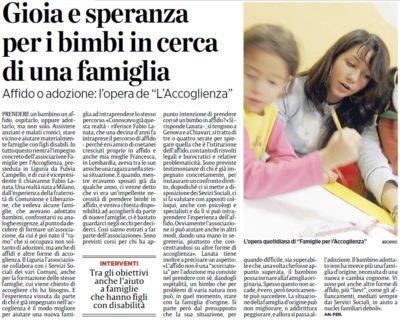 Il Secolo XIX incontra la nostra realtà associativa in Liguria: “Prendere un bambino in affido, ospitarlo, oppure adottarlo, ma non solo. Assistere anziani e malati cronici, stare vicino e aiutare materialmente famiglie con figli disabili. In tutto questo rientra l’impegno concreto di Famiglie per l’Accoglienza…”.