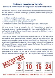 Con questo percorso intendiamo approfondire l’esperienza dell’affido familiare e dell’ospitalità semplice (diurna, fine settimana…) a favore di bambini che si trovano in una situazione di difficoltà.