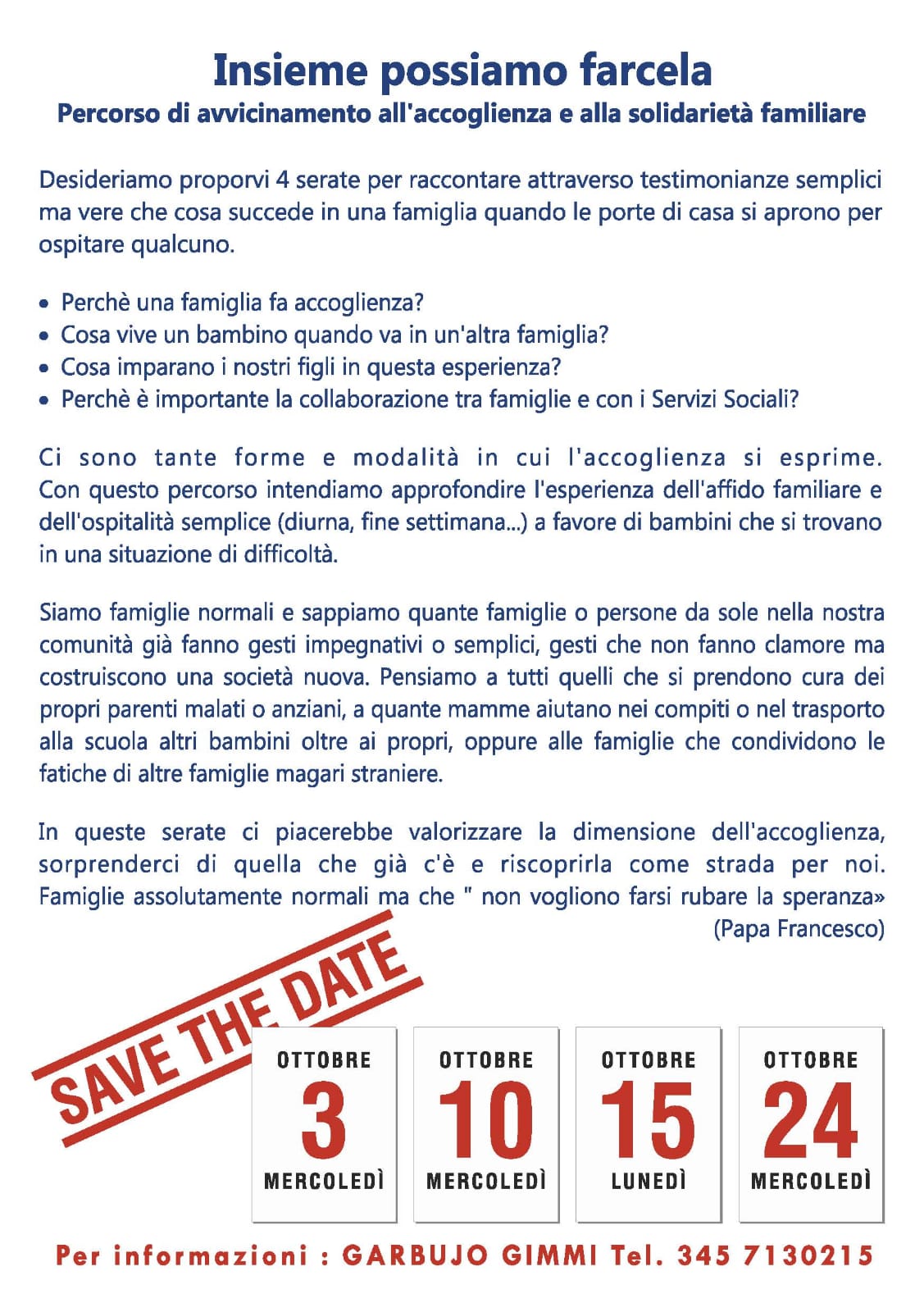 Desideriamo proporvi 4 serate per raccontare attraverso testimonianze semplici ma vere che cosa succede in una famiglia quando le porte di casa si aprono per ospitare qualcuno.