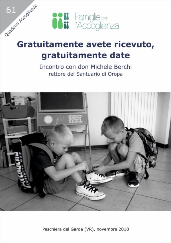 Proseguiamo i suggerimenti di lettura. Si tratta di una dispensa di Famiglie per l’Accoglienza, che riporta l’intervento di don Michele Berchi – rettore del Santuario di Oropa- in occasione del seminario nazionale a Peschiera del Garda nel novembre 2018: “Gratuitamente avete ricevuto, gratuitamente date”. Ne riproponiamo la lettura attraverso l’aiuto che ne ha ricevuto una nostra amica nel vivere la situazione attuale.